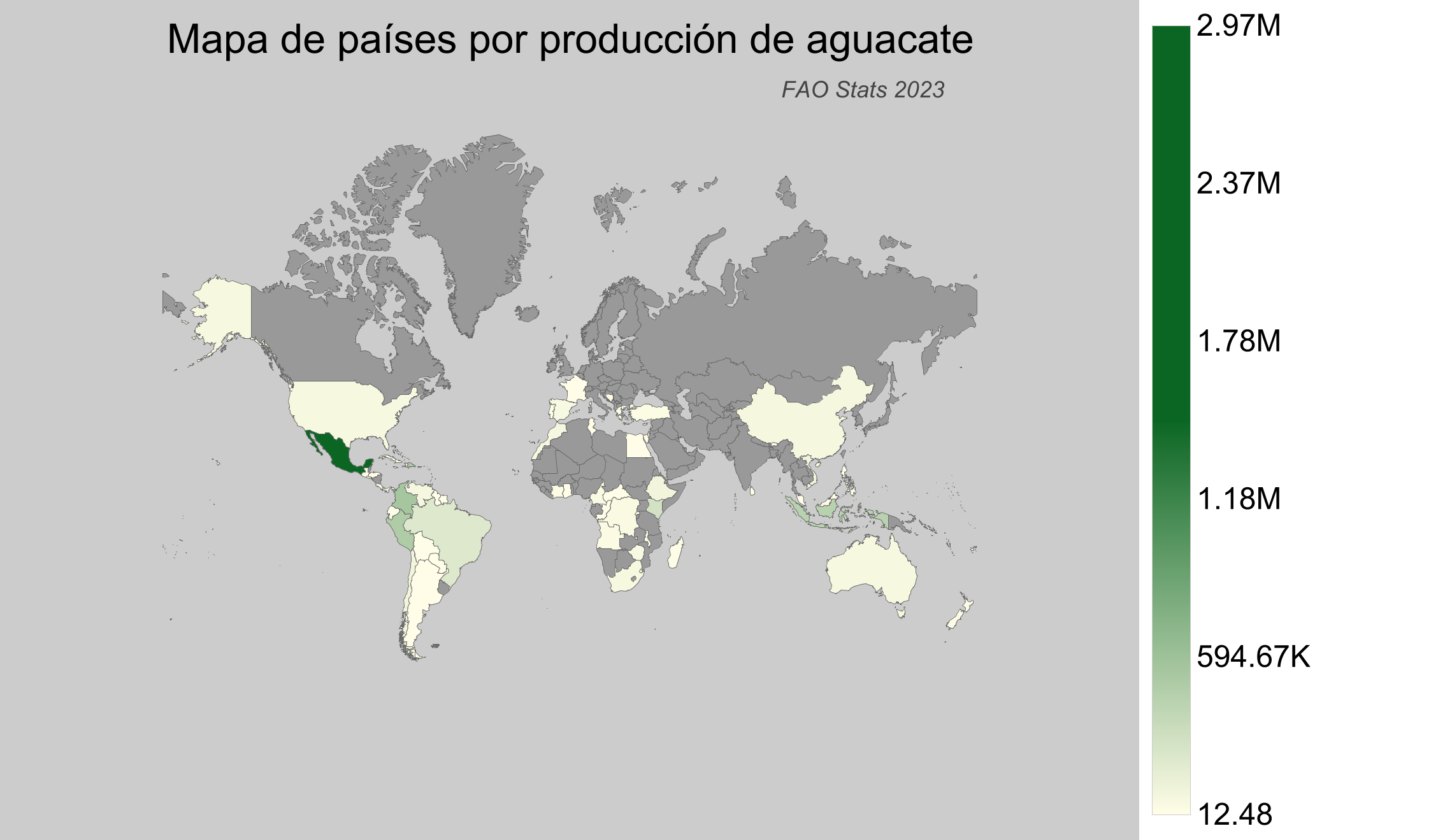El aguacate es una fruta rica en nutrientes y esencial en diversas cocinas alrededor del mundo. Crece mejor en climas tropicales y subtropicales y se cultivan principalmente en regiones con temperaturas cálidas. Los datos presentados aquí reflejan la producción mundial para el año 2023, según la base de datos más reciente de la Organización de las Naciones Unidas para la Alimentación y la Agricultura (FAO) hasta el año 2025.