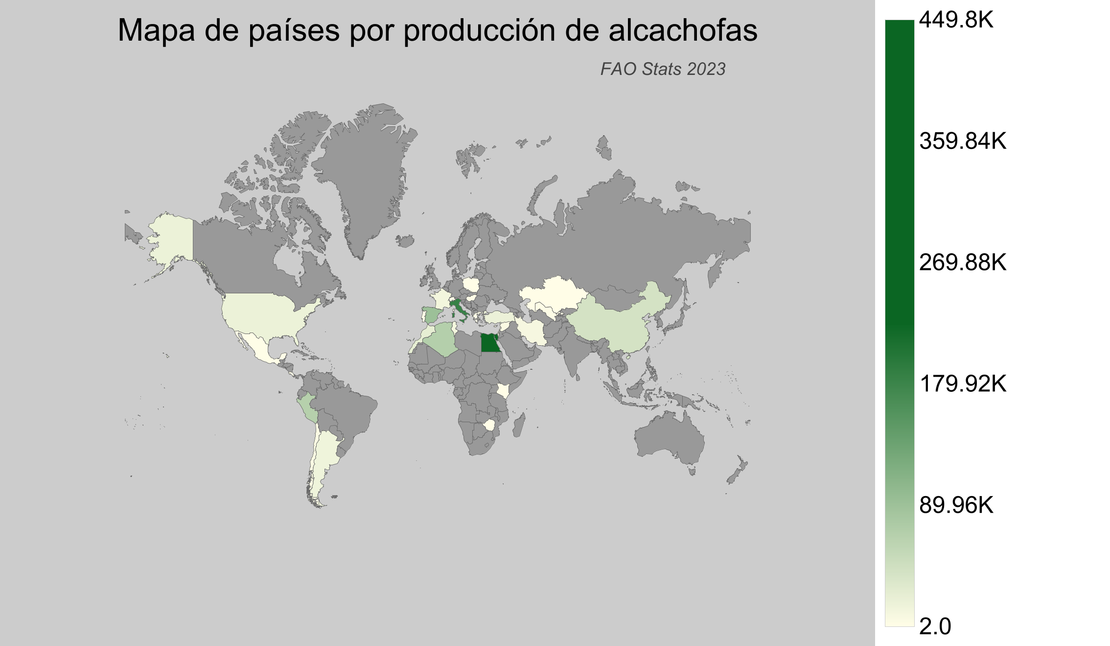 La producción global de alcachofas en 2023 fue de aproximadamente 1.6 millones de toneladas. Desde 1961, cuando la producción era de alrededor de 855 mil toneladas, ha habido un notable aumento, reflejando un crecimiento constante y ampliado interés en el cultivo. Comparado con 1961, la producción global de 2023 ha crecido considerablemente, registrando cambios significativos a lo largo de las décadas.