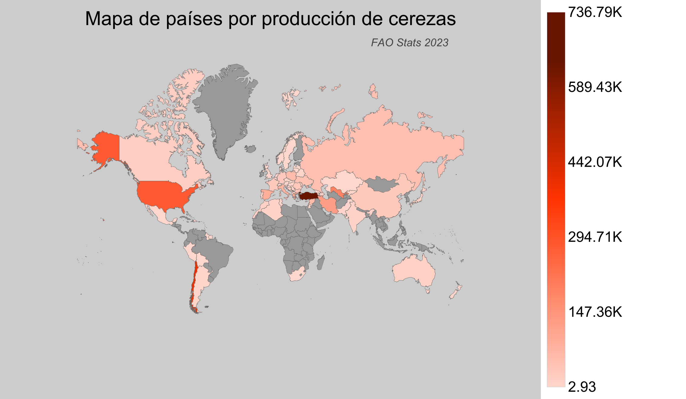 - Turquía lidera la producción mundial de cerezas con aproximadamente 737 mil toneladas en 2023.