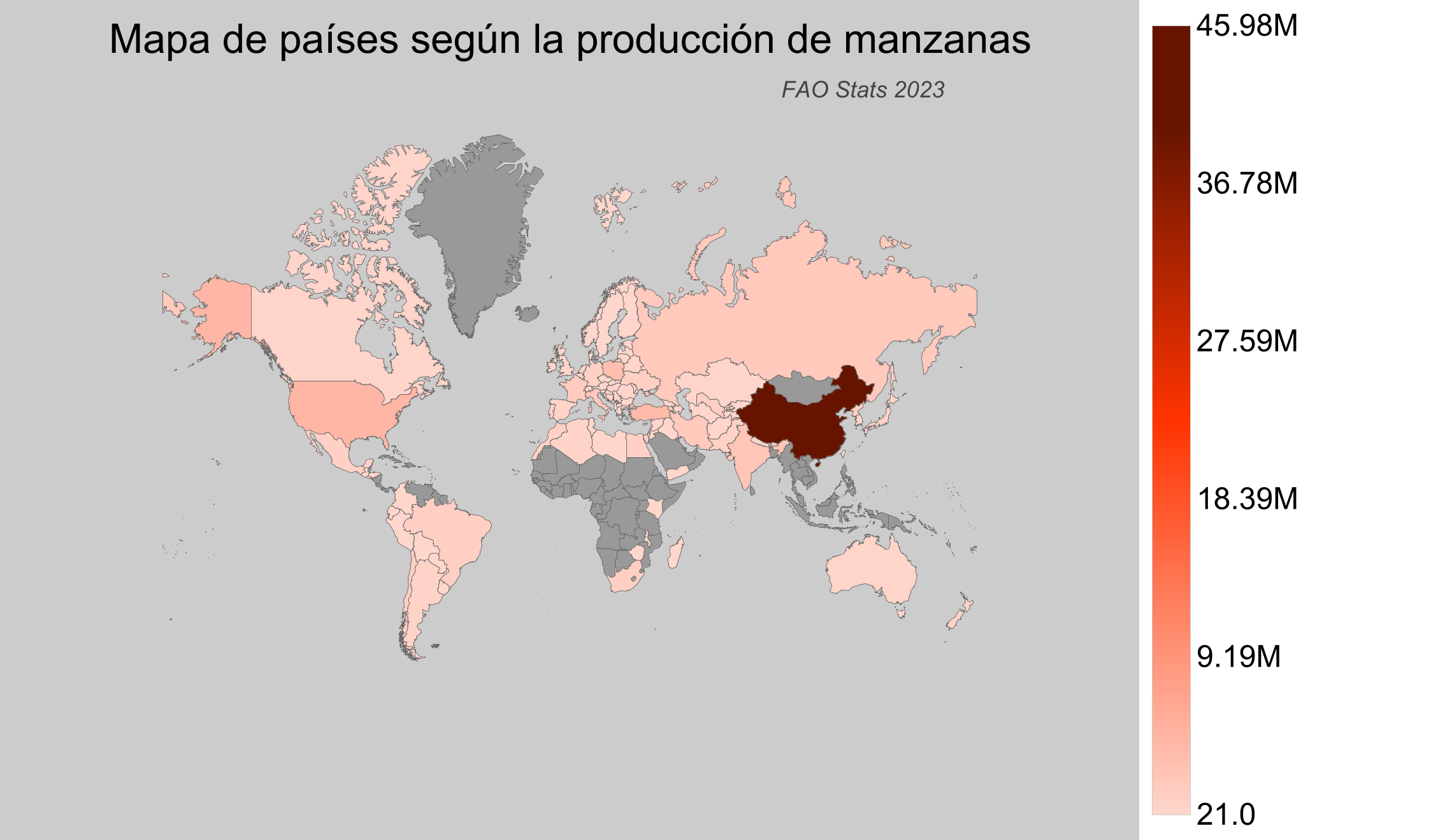 - A pesar de no aparecer entre los principales productores, Argentina realiza una contribución significativa al total global de producción de manzanas.