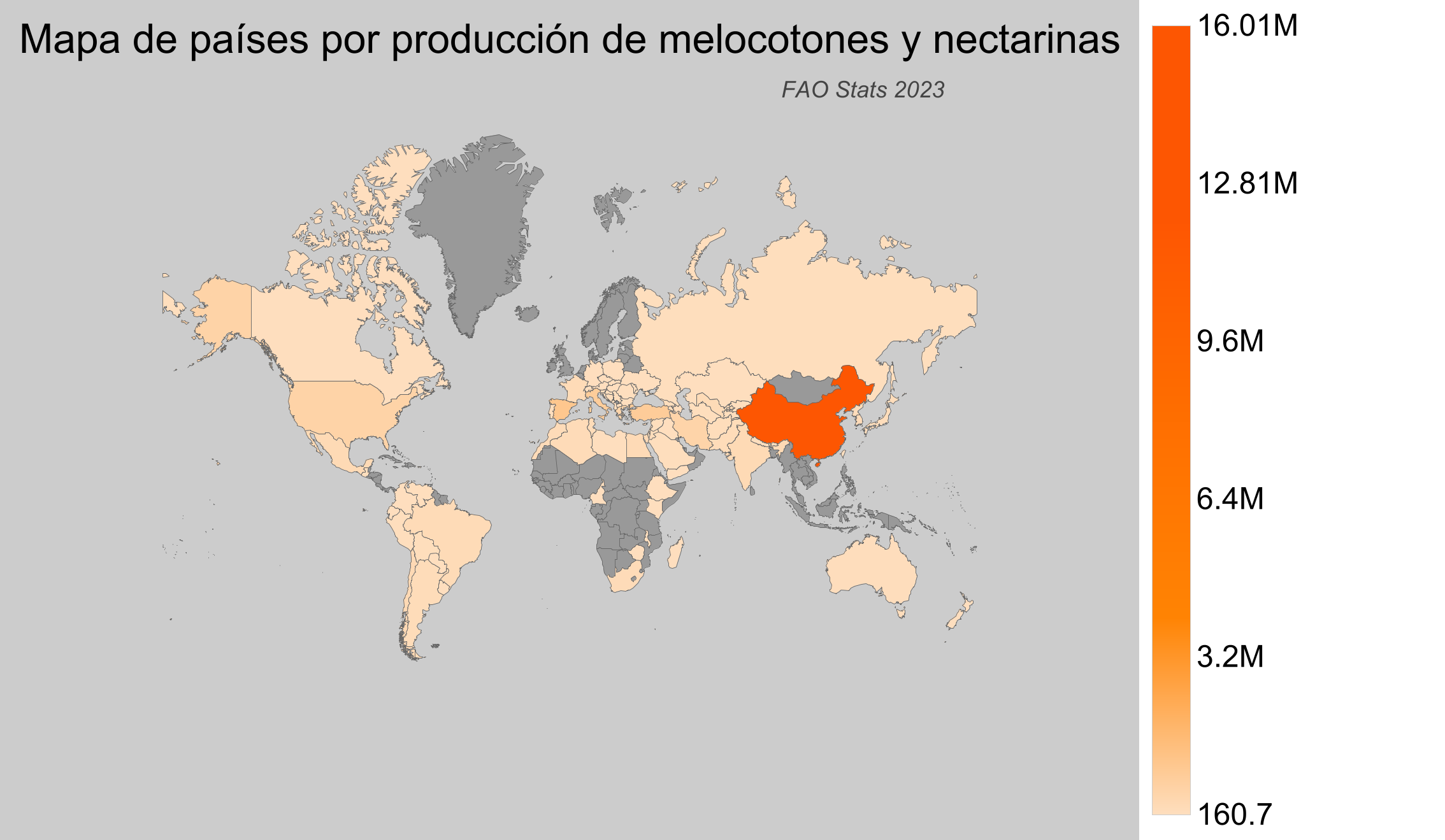 El melocotón y la nectarina son frutas de gran importancia global, no solo por su atractivo sabor y valor nutricional, sino también por su rol en la economía agrícola de muchas regiones. Estas frutas prosperan en climas templados y soleados y son características de regiones con inviernos fríos y veranos cálidos. El seguimiento de su producción es crucial para comprender las dinámicas del mercado agrícola. Según las estadísticas más recientes disponibles en 2025 de la base de datos de la Organización de las Naciones Unidas para la Alimentación y la Agricultura (FAO), estos son los datos de producción para 2023.