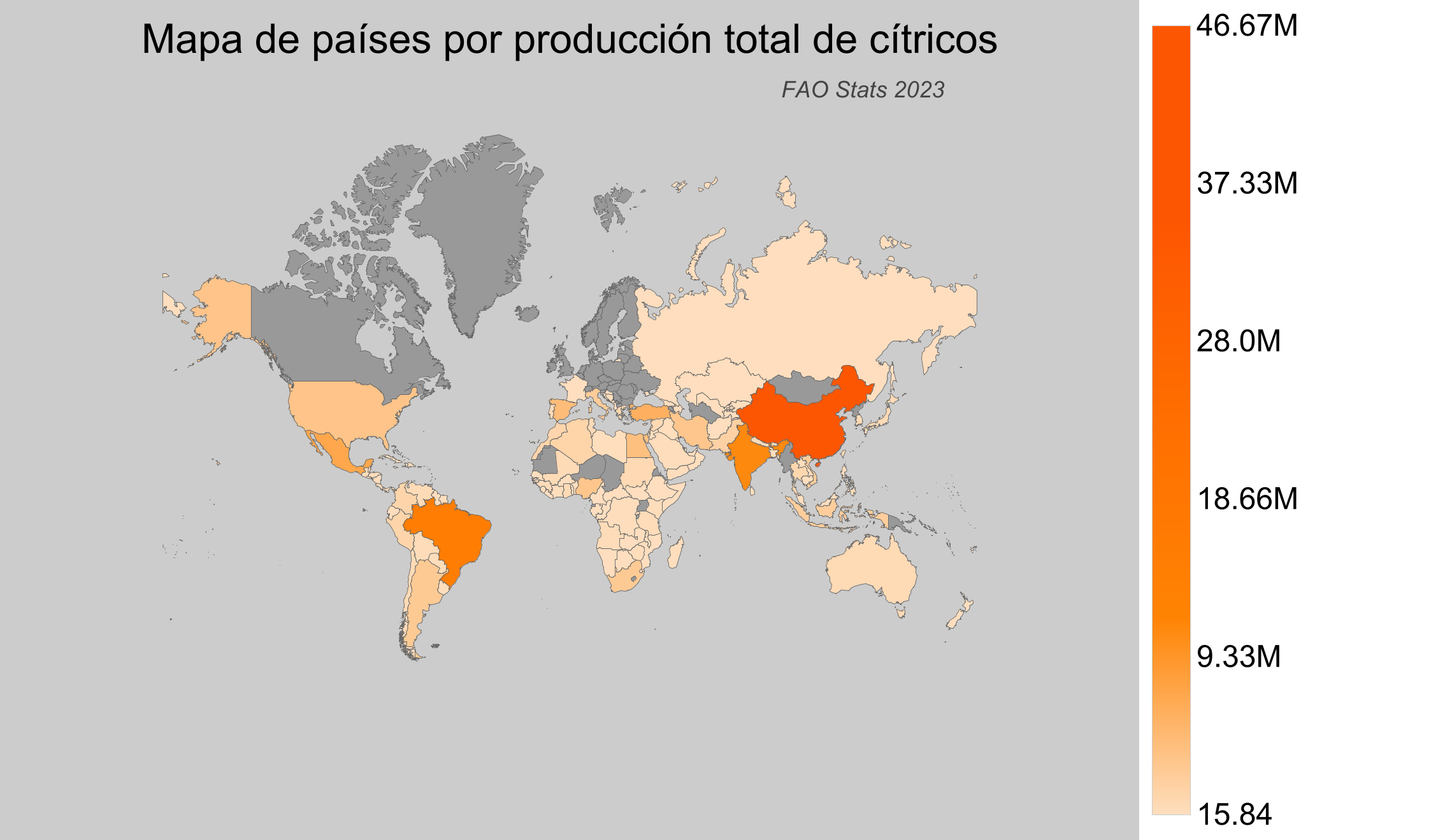 - Aunque no está en el podio de los mayores productores, Argentina contribuye con alrededor de 3.5 millones de toneladas de cítricos.